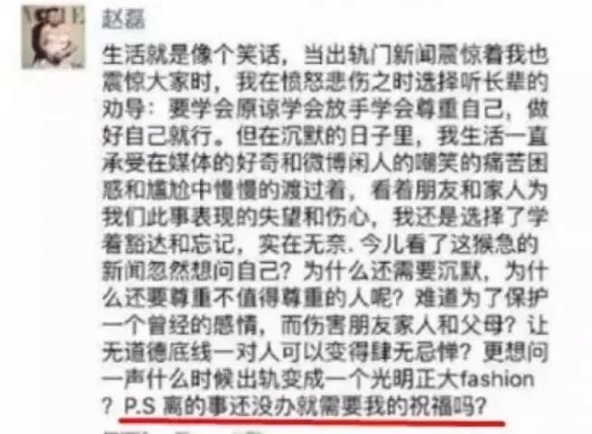 请牢记这条真理:能为了你捅别人一刀的人,跟你闹掰后,保不齐捅你一刀。严谨来讲,赵磊捅过秦舒培两刀。先是和陈冠希曝恋情的2016年,赵磊发文说还没跟秦舒培离。