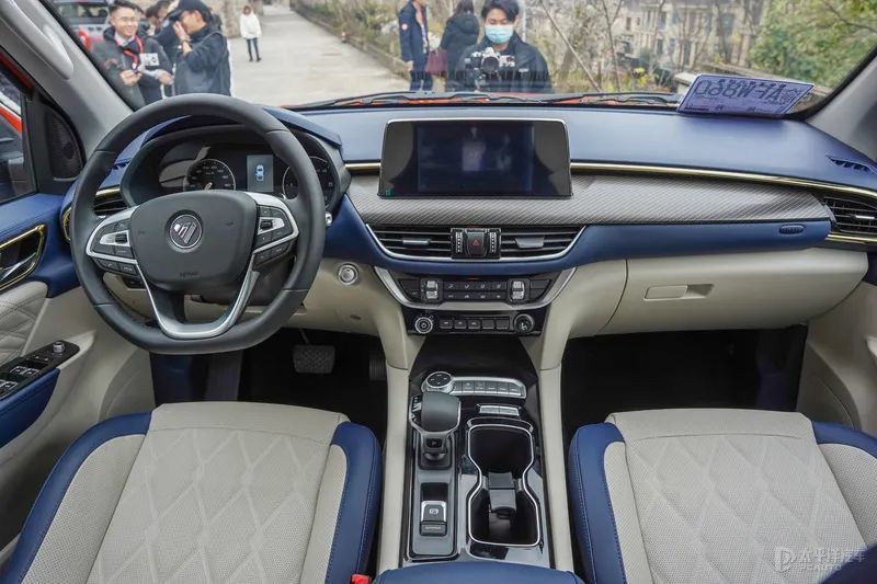 与车体配色理念一直,内饰同样不会弱了驭炮大将军在潮流与时尚方面的风头,体验车型采用蓝白双拼主色调还是非常醒目的。
