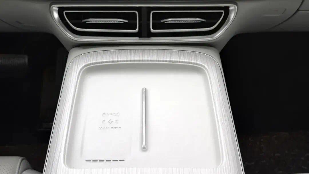 中控屏下方是出风口,再下方是手机面板,但即便是顶配版本这里也仅有一个50W无线充电。