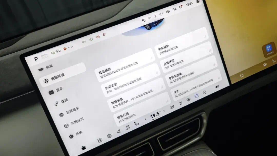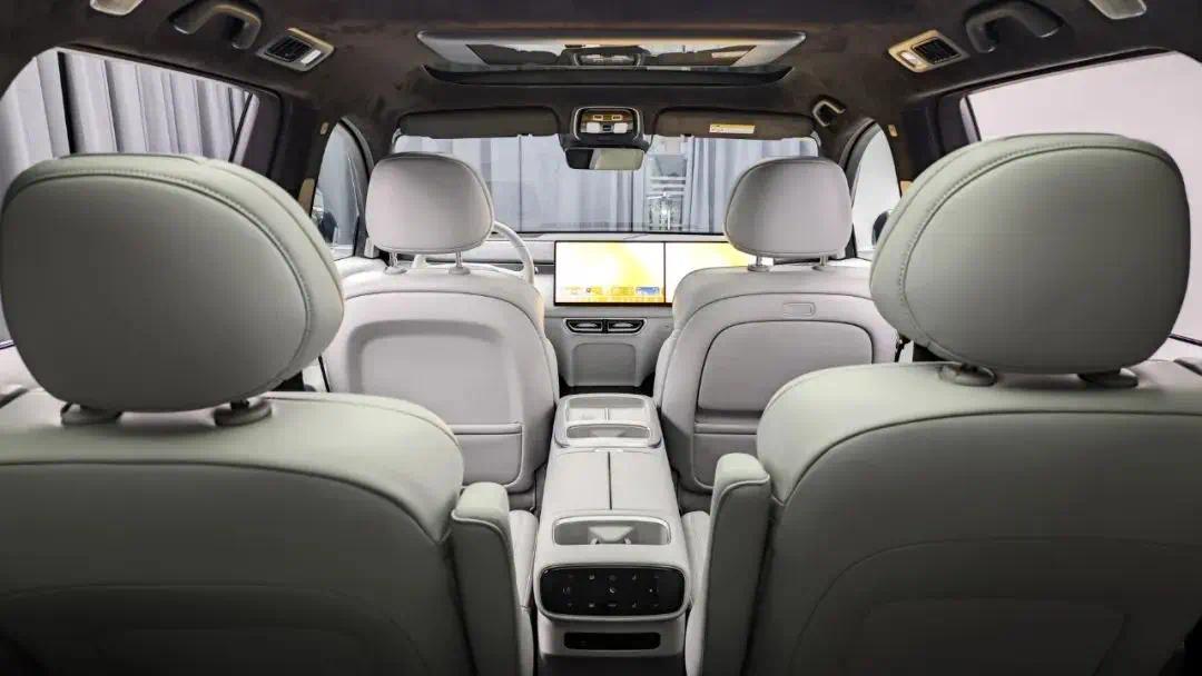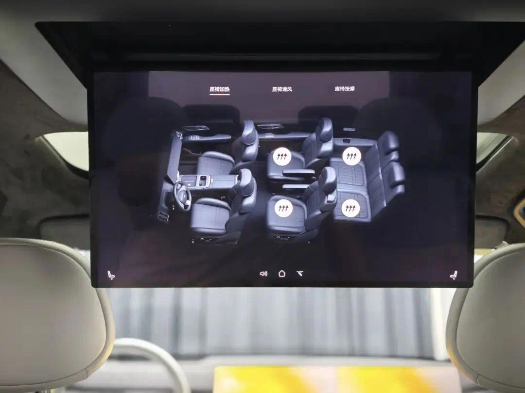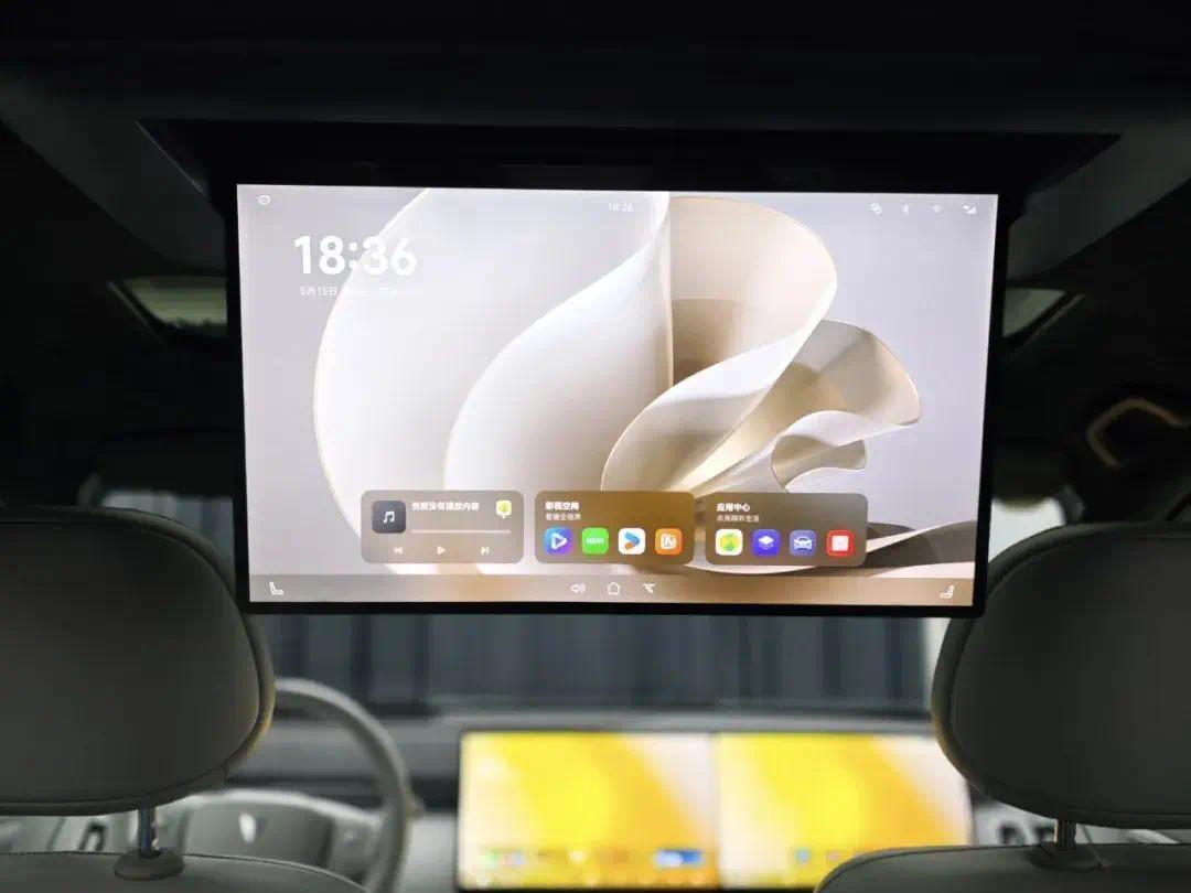 此外,第二排座椅上方还有21.4英寸吸顶娱乐屏,也能和华为鸿蒙座舱实现多屏联动,第二排座椅功能也可以在这里控制。