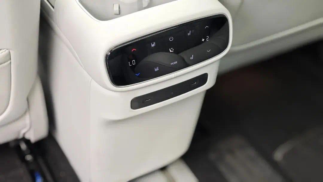 后排空调控制区域,空调温度、智能中岛、座椅位置都可调节,下方则是两个60W的C口电源。