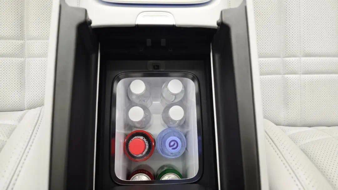 中央扶手区域后方是一个10L的冷暖冰箱,支持零下6摄氏度到50摄氏度调节范围,也是选装才有。