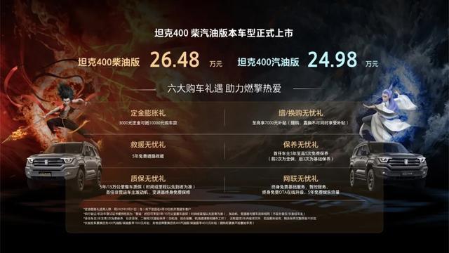 2月22日,坦克品牌坦克400汽柴油版双车上市,其中,汽油版24.98万元,柴油版 26.48万元。