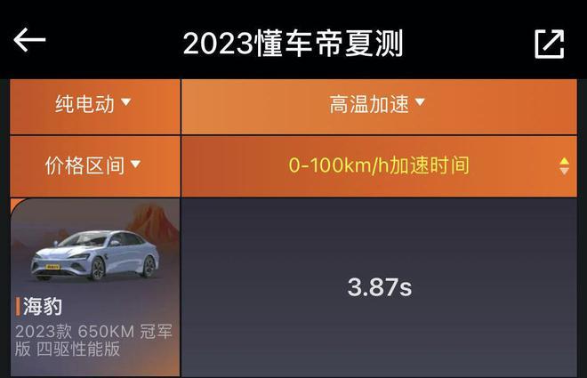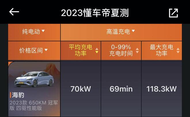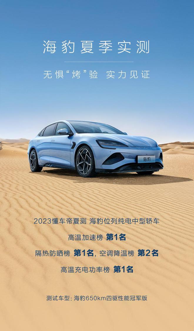 近日,“2023懂车帝夏测”成绩榜单正式发布。本次“夏测”,由于举办地新疆吐鲁番遭遇罕见的高温天气,部分测试时段的最高气温高达48℃,堪称终极“烤”验。海洋“豹”款海豹(本次测试车型为海豹冠军版650km四驱性能版,以下简称海豹)作为比亚迪品牌运动和舒适平衡得最好的车型,也通过本次“夏测”充分展示了自身的实力。