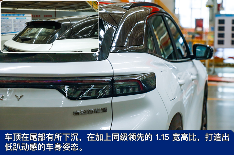 车身侧面饱满流畅,但上扬的下窗线、方正的轮眉等设计元素依然能看到奇瑞大蚂蚁的影子。不过,新车采用悬浮式车顶,并换装了半封闭式轮圈,更有时尚气息。