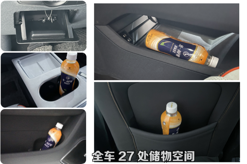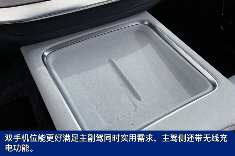 主副驾中间操作台上面加入手机无线充电面板以及双杯托。底部则采用镂空设计,以此来提升车内的储物能力,全车多达27处储物空间。
