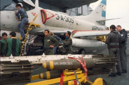 图30. 阿根廷“5月25日”号航母,背景是A-4Q天鹰攻击机,前景是美制MK82炸弹,弹尾加装了蛇眼减速器套件,炸弹头部还没有装引信,炸弹上写的“HMS INVINCIBLE”,意思是“无敌”号接招吧