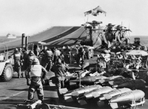 图29. 英国在马岛战争中也使用MK-XVII炸弹,这是旗舰“赫尔姆斯”号航母,前景是MK-XVII炸弹,背景是一架正在起飞的海鹞