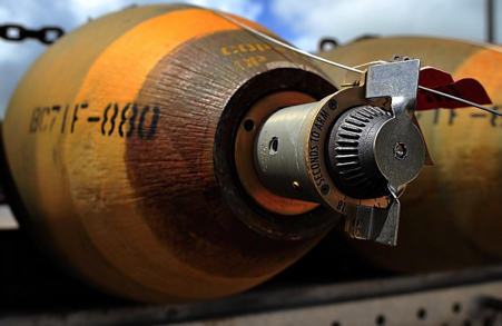 当炸弹装上触发引信之后,安全问题就出来了。 怎么保证炸弹在投弹之前不会被错误引爆,又如何保证投弹之后不会过早引爆炸到载机。实际上为了安全起见这时引信是不工作的,即使你用力撞击引信也不会令引信起爆,因为此时引信没有放在起爆位置。如何引爆引信呢?这些引信头部都有一个小叶轮,叶轮和引信之间有一个锁孔被一根细钢丝锁住,这根钢丝保证叶轮被锁住,在离开机身之前不会旋转。