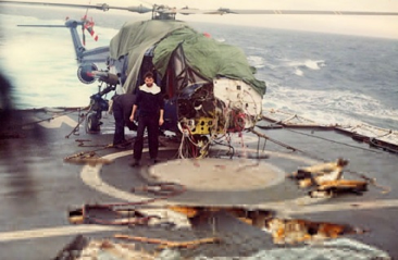 图31. 这是英军“大刀”号(Broadsword)护卫舰被一枚阿空军的MK XVII炸弹命中,炸弹撕掉了这架山猫直升机的机鼻,打穿船身从另一侧掉到了海里,在海中引爆