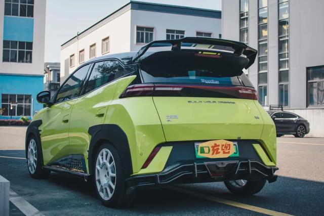 下面这台比亚迪海鸥也挺有意思的,直接换上了碳纤维纹路的前唇和后扩散器,而且在车尾处还装上了大尾翼,这海鸥看着不好惹啊,我看谁还说小车不适合玩这种竞技风格的改装。