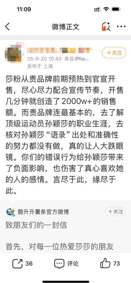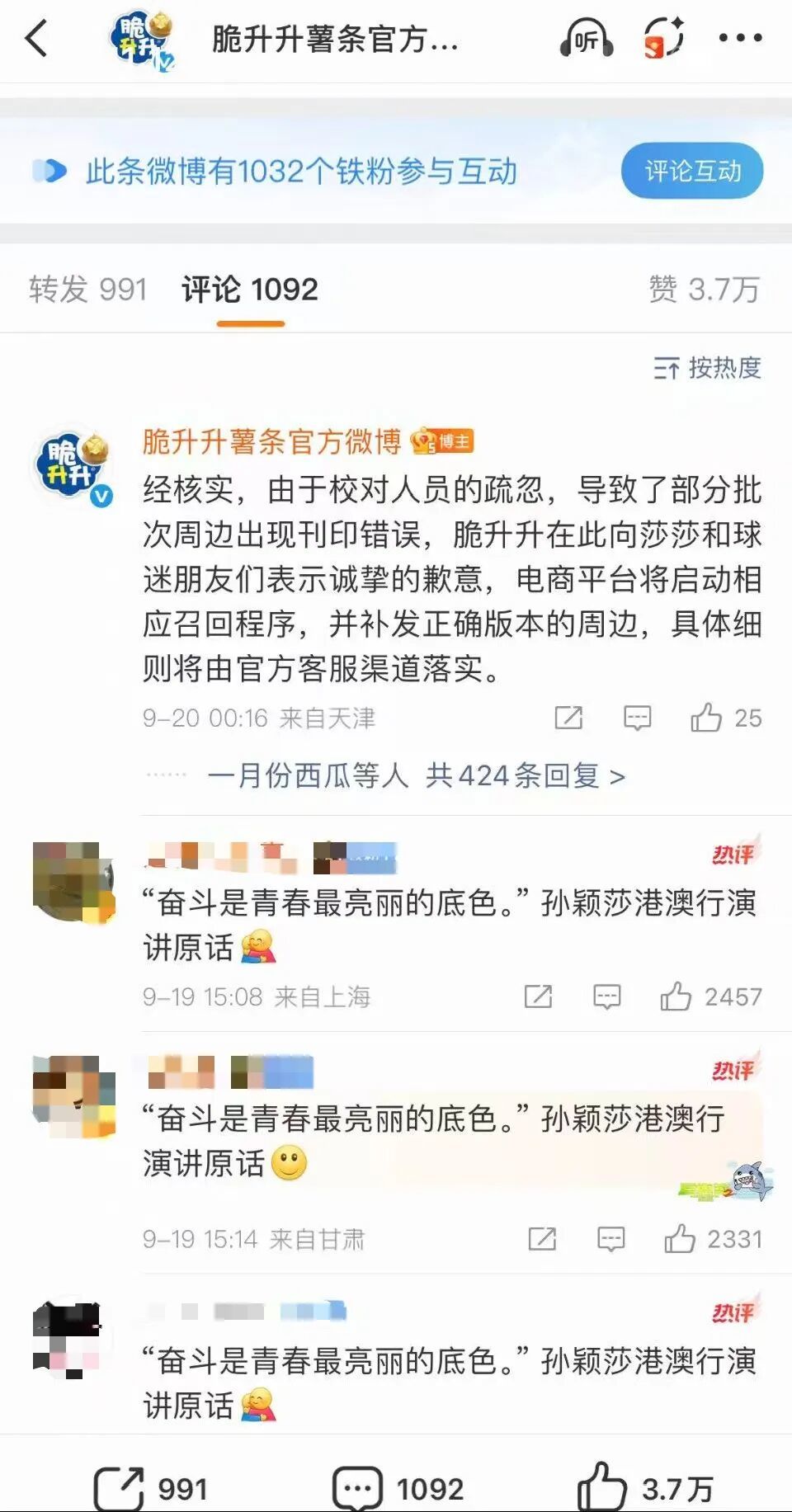 9月20日上午,@脆升升薯条 官方微博 发布致朋友们的一封信,向孙颖莎和球迷朋友们致歉。