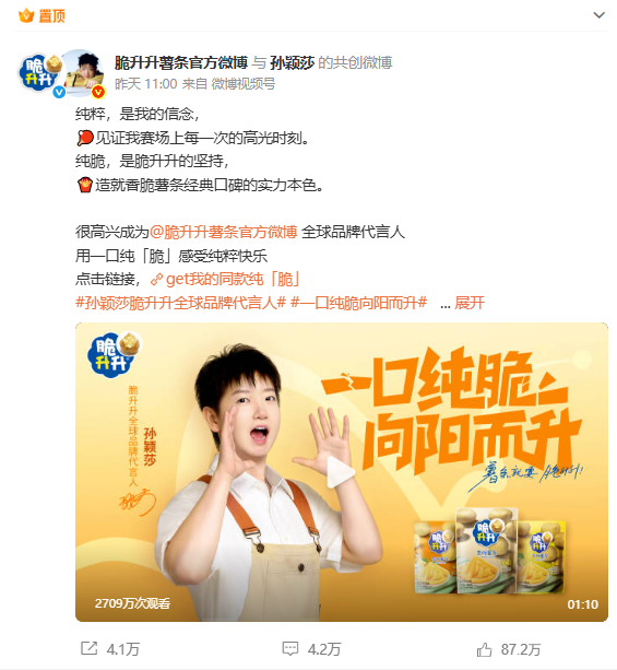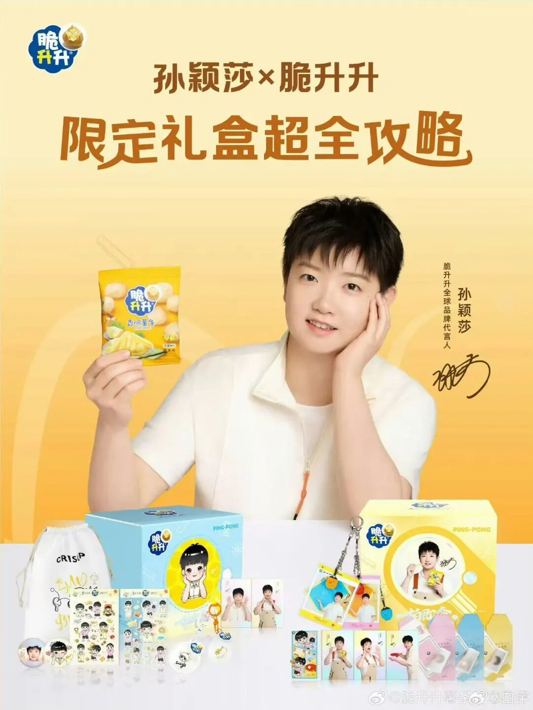 据了解,2025年9月19日,脆升升正式官宣孙颖莎成为全球品牌代言人,合作主题为“一口纯脆,向阳而升”。