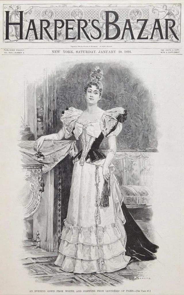 1894年,《Harper’s BAZAAR》首次以插画形式呈现Worth设计的晚礼服,画中贵妇的蓬裙、手套与珠宝的搭配比例,成为当时美国上流社会的着装模板。这种通过杂志传播“完整造型”的模式,悄然播下了时尚民主化的种子。