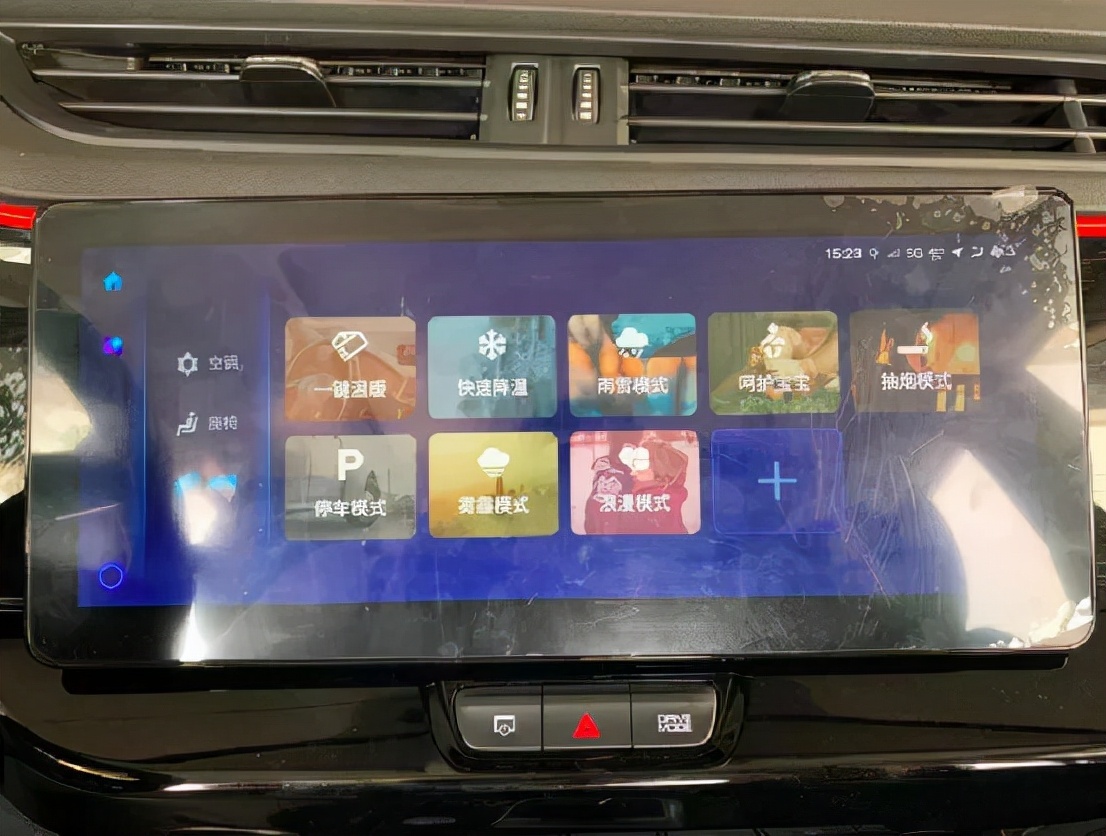 中控大屏系统能根据不同场景支持多种车内模式的切换,比如浪漫模式、宝宝模式、停车模式等,并且支持抽烟模式,在此模式下,会自动打开天窗和环保系统。实测中语音控制系统相对反应精准,但屏幕的反应稍显卡顿,反应速度偶尔需要等待。