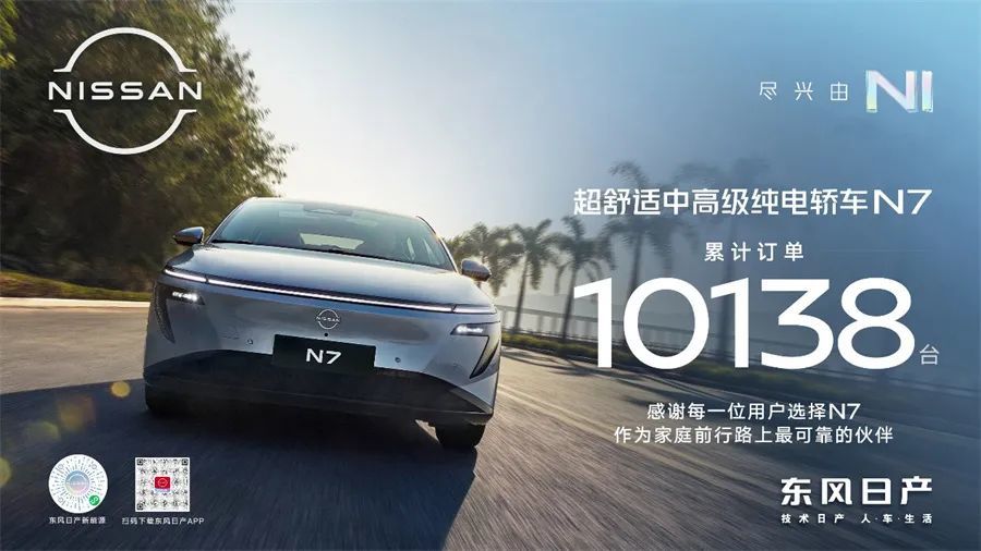 4月27日,东风日产天演架构下首款新能源战略车型——东风日产N7正式上市,售价区间为11.99万-14.99万。产品上市即热销,累计订单超10000台。