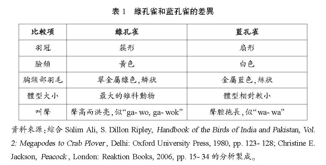 在此有必要先明確生物學意義上綠孔雀與藍孔雀的差別。根據現代生物學的研究,可將二者差別列為表1。依據二者特徵的差異,又可以細分為外形與叫聲兩類。較為幸運的是,儘管文獻對孔雀外貌特徵的記載較為稀少且不完備,但還是保留了一些描述,吉光片羽,彌足珍貴。