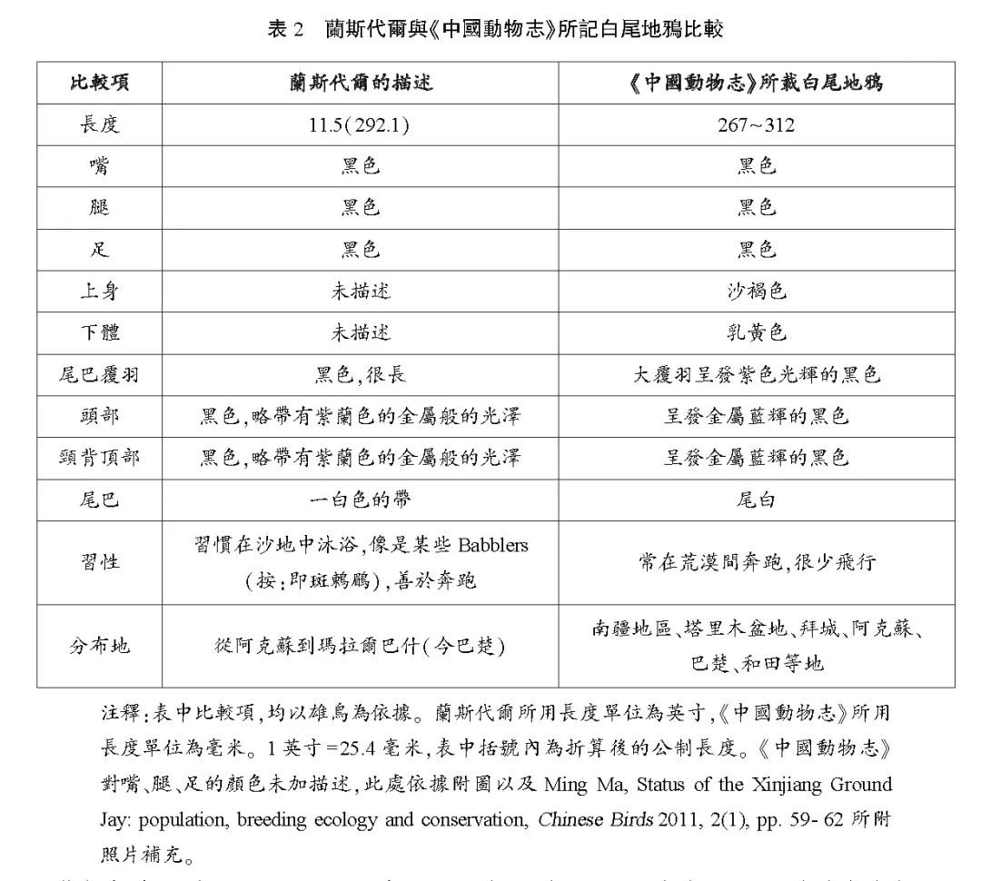 《新疆南部的鳥獸》一書將黑尾地鴉(Podoces hendesoni)、白尾地鴉(Podoces biddulphi)、褐背地鴉(Podoces or Pseudopodoces humilis)歸入雀形目(Passeriformes)椋鳥科(Sturnidae),《中國動物志》則將它們歸入雀形目鴉科(Corvidae)地鴉屬(Podoces Fischer)。雖然二書對具體的科屬存在差別,但上述幾種地鴉均屬於雀形目,應無疑義。而“鴨”屬於雁形目(Anseriformes),在鳥類生態類群中屬於游禽,與生活在沙地環境中的地鴉屬(鳴禽地棲)並不相類,不可混為一談。此為其一。王氏認為在19世紀後半葉,“科學界還沒有對其進行科學分類”,這種說法也不準確。蘭氏在文中說明,當時已知的地鴉包括了里海/土庫曼地鴉、黑尾地鴉、褐背地鴉和白尾地鴉4個變種,只是未確定它們在分類學上的位置。此為其二。其三,蘭氏捕捉和運送到英國的都是白尾地鴉。蘭氏引述德萊塞(Dresser)之言,認為這類鳥是這一地區特有物種,“僅限於草原地區”,在歐洲非常少見。他又引述艾倫·休姆(Allan Hume)的話,指出黑尾地鴉“在外表形態上最接近於紅嘴山鴉”。最後還說:“在我收集的運到英國的一種Podoces鳥,是被比杜爾夫(Biddulph)確定的那種鳥(P. biddulphi)。”黑尾地鴉和白尾地鴉在形態上的區別僅在於前者頰部不呈黑色,且尾羽全黑。筆者將蘭氏對地鴉的描述以及《中國動物志》對白尾地鴉的記載進行了對比(見表2)。綜合蘭氏的觀察記述以及最終的物種鑒定結果來看,他捕捉到的地鴉應是白尾地鴉。但不知何故,王氏認為蘭氏觀察到的是黑尾地鴉,運到英國的才是白尾地鴉。