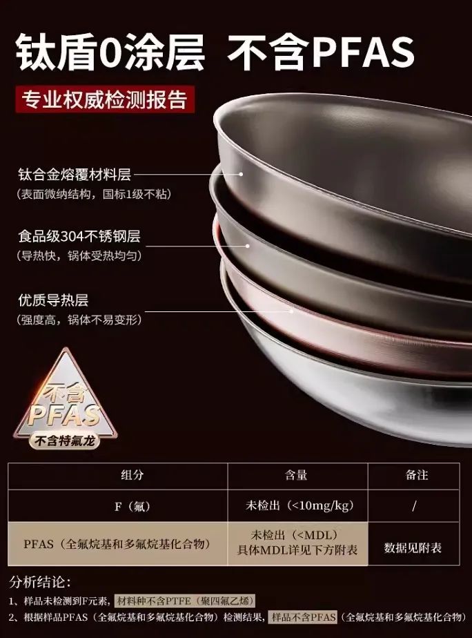 表层是食物接触层,钛含量高达93.9%,无涂层!保鲜更持久,烹饪食物可以更好地呈现原汁原味。