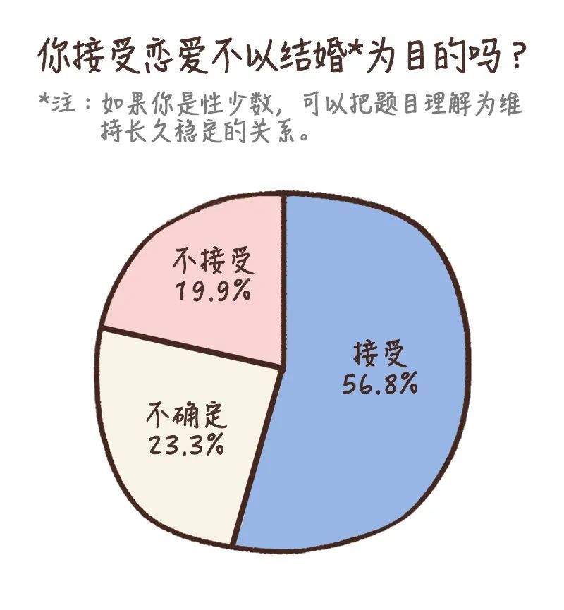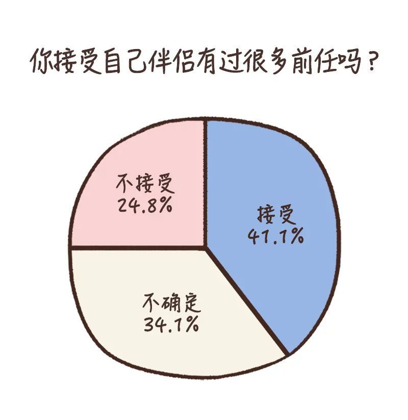 从我们的调查结果来看,大家对亲密关系的态度,在某些方面,确实有变得更开放一些。比如,有最多比例的受访者(41.1%)接受伴侣有很多前任;超过一半(56.8%)的受访者表示,可以接受不以结婚为目的的恋爱。