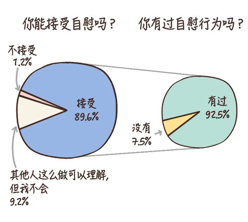 然后,我们来说说自慰。不仅大部分人(89.6%)都能接受自慰,接受的人中也有92.5%的人亲身实践过。
