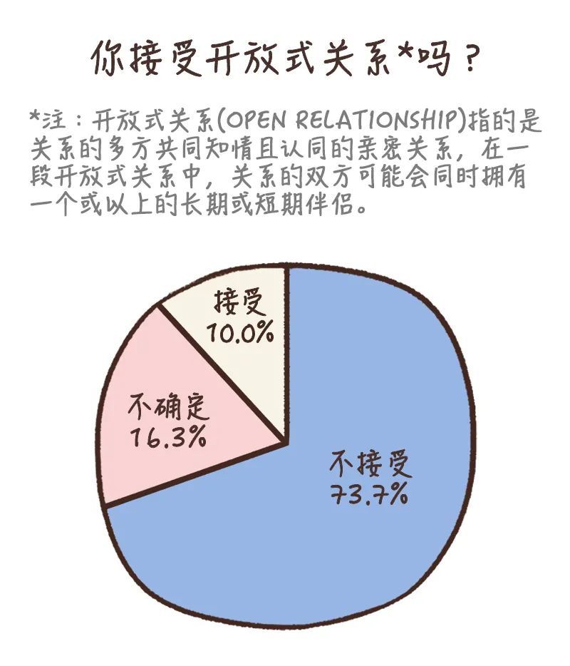 但是,人们对亲密关系的态度,还没有发展到完全开放的地步。比如说,在“你是否可以接受开放式关系”这个问题上,高达73.7%的受访者都表示不接受。