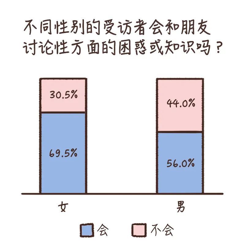 于是,我们询问了一些男性同胞,他们表示,男性和朋友谈论性的频率也是很高的,但之所以在这道题目中男性选择“会”的比例比女生低,可能是因为男性虽然会和朋友口嗨,但不大会是和朋友“讨论困惑”,这样可能会显得自己“有点弱”。
