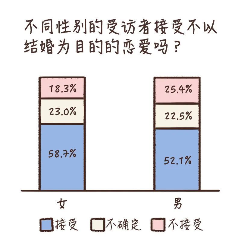 有意思的是,我们发现男生比女生更不能接受不以结婚为目的的恋爱(p<0.01)。