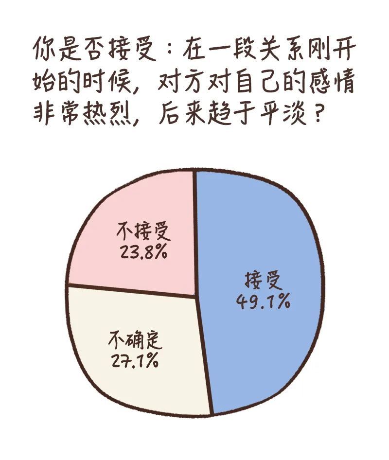 针对这两种情况,大部分受访者的回答都是:可以接受(分别占67.3%和49.1%)。人们越来越意识到,激情并不是爱情的全部,随着时间发展,激情和荷尔蒙的感觉消退,感情变淡是很正常的事情。