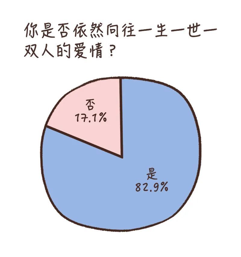 此外,有超过八成(82.9%)的受访者表示,自己依旧渴望“一生一世一双人”的理想爱情,这一结果在不同的性别、年龄段都没有显著差异。不过我们发现,18岁以下的受访者,相对而言没那么向往这种模式的爱情(Ta们中有76.5%的人选择“是”,而在其他年龄段,选择“是”的人都达到了80%以上 )。但也不那么重要啦,小朋友嘛还有无限可能,等ta们更成熟的时候,爱情观或许也会发生变化。