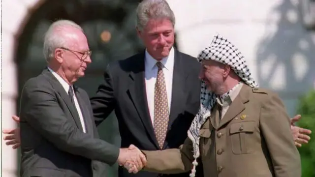 1990年代,美国为了控制中东地区,促成以色列总理拉宾和巴勒斯坦解放组织阿拉法特达成和平协议。巴以关系出现了好转迹象。