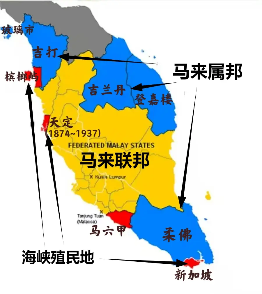 1824年,英国将马六甲海峡附近的柔佛苏丹国划为自己的保护国。此后,英国势力渗入整个马来半岛,并将扼守马六甲海峡的新加坡、槟城等重要城市划归由英国直属的海峡殖民地。