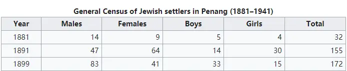 1895年,根据英国的人口统计,马来半岛的犹太人数量达到1万人。其中,槟城的犹太人人口达到了180人。
