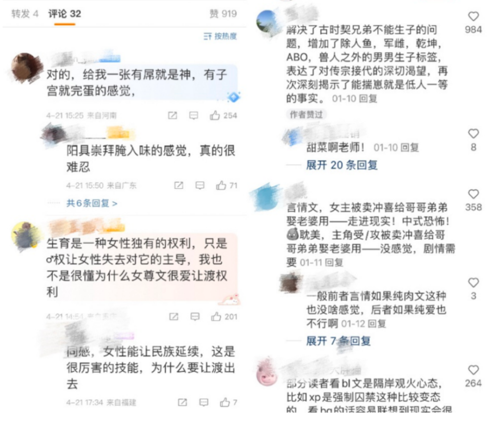 例如,让男性怀孕生子的女尊文或耽美文早年能够大行其道,多基于一种简单朴素的想法,“我要让男人也吃吃这苦”。但如今看来,这句话是如此的政治不正确。生育是女性特权,怎可自我贬低、拱手让人?BL配不配生子、女尊文该由男主生还是女主生,正在掀起新一轮大辩论。