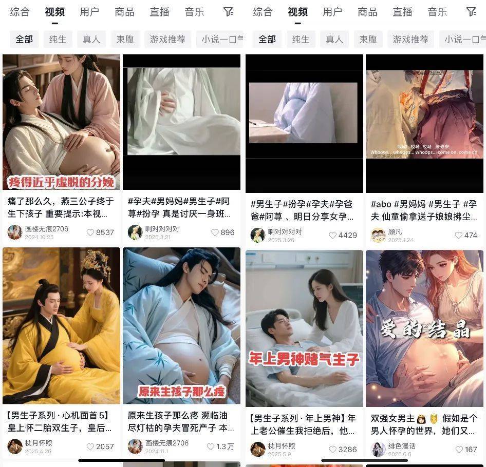 男孕(mpreg)也是一种性癖,提供给爱好者凝视男性、支配男性的权力感。或者单纯追求一种感官刺激,毕竟生产也算一种战损虐身。以至于它不仅以小说漫画广播剧等传统形式流行,在AIGC普及之后,更是成为短视频上的热门题材。