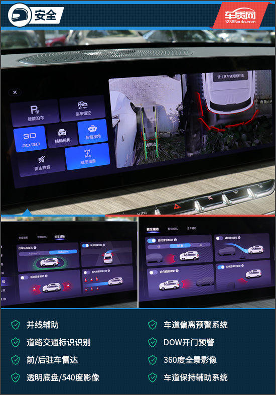安全配置方面,这台车提供并线辅助、车道偏离预警系统、道路交通标识识别、前/后驻车雷达以及360度全景影像等功能。其中,360度全景影像虽然存在一定畸变情况,但胜在功能丰富,例如循迹倒车、2D/3D模式切换、智能视角、辅助视角以及透明底盘等均可支持,便于驾驶者查看车辆周边状况。