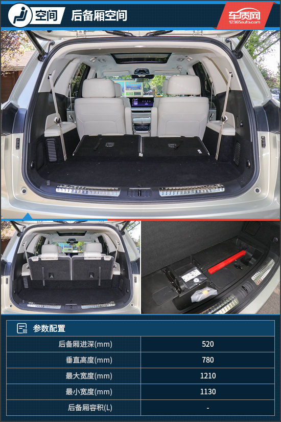 后备厢方面,在第三排座椅打开的状态下,新车仍有不错的后备厢容积表现。将地台掀起后,底部配有一些随车工具和隐蔽的储物槽。第三排座椅支持比例放倒,放倒后此时的后备厢容积相当可观,地板也能做到纯平状态,搬拿大件物品较为便捷。
