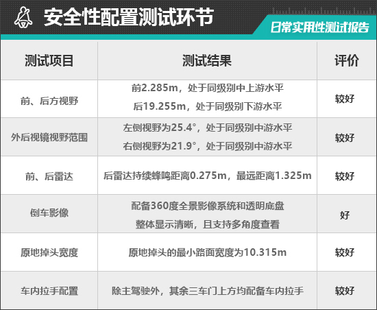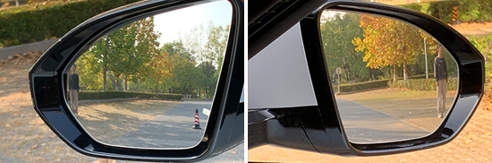 评测车左、右外后视镜均采用普通镜片。经实测,左、右外后视镜视野范围分别为25.4°和21.9°,均处于同级别中游水平。