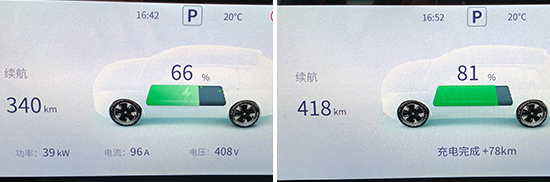 此外,对于充电效率我们也进行了测试。实测人员使用快充桩充电10分钟后(波峰用电),电量从66%充至81%,续航里程增加78km,与车辆电脑预计的用时基本吻合。