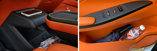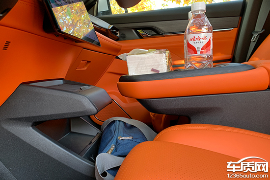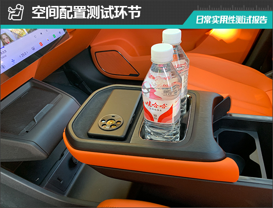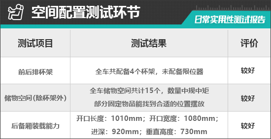对于车内使用空间的测试,只针对前排触手可及的空间,不包括手套箱、中央扶手箱等需开启的空间。测试方法是将以下固定物品全部放置在前排的各个储物空间内,通过固定物品的放置情况来判断车辆储物空间的表现。测试选定的固定物品为:2瓶常规大小的矿泉水、1部大屏手机、1支口红、1个挎包、1副墨镜、1把折叠雨伞以及1包常规尺寸的抽纸。