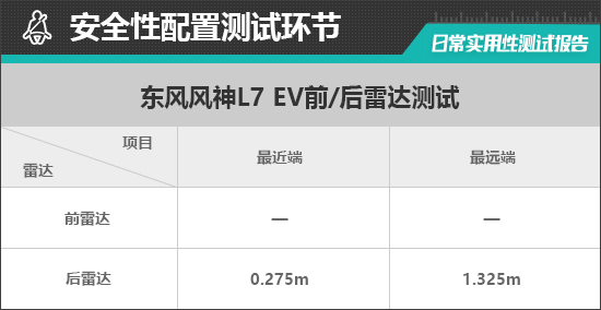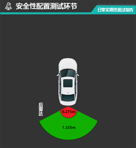 在雷达测试过程中,评测车的后雷达最远可在1.325m处感应到后方物体,后雷达功率表现中规中矩。从实测数据来看,后雷达持续蜂鸣阶段最近距离为0.275m,表现好于同级别车型平均水平。