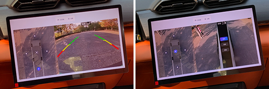评测车配备了360度全景影像和透明底盘,方便驾驶员查看车辆周边情况。影像清晰度不错,车辆周围的畸变控制也比较合理,实用性不错。
