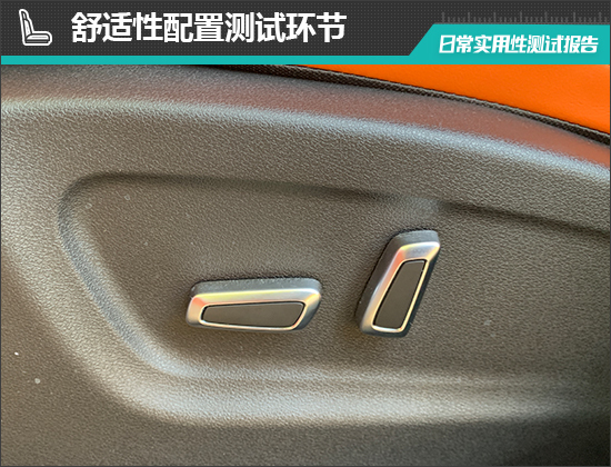 座椅方面,评测车主驾驶座椅电动调节按键位于座椅侧面底部,调节按键位置合理。此外,评测车仅主驾驶座椅支持3档加热和通风功能,舒适性配置一般。