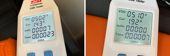此外,我们对USB接口的电压与电流进行了测试。其中,前排USB Type-A接口的电压和电流分别为5.02V和1.43A。后排USB Type-A接口的电压和电流分别为5.1V和1.92A。