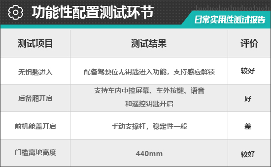 对于消费者来说,门槛离地高度一定程度上决定了上下车便利性。根据实测结果来看,评测车门槛离地高度为440mm,驾乘人员日常上下车比较方便。