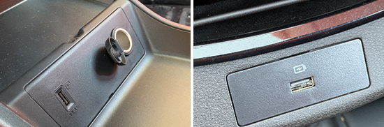评测车配备2个USB Type-A接口。其中,前排1个USB Type-A接口位于前排中控台下方储物槽内,后排1个USB Type-A接口位于空调出风口下方,接口数量较少且兼容性一般。此外,前排储物槽内还提供1个12V电源接口。