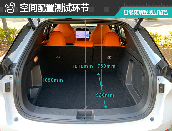 后备厢内部造型较为规整,地板平整度不错。后排座椅支持比例放倒,放倒后可以进一步拓展后备厢空间。对于评测车后备厢的基础数值,我们也进行了实测,开口长度为1010mm;开口宽度为1080mm;后备厢进深为920mm;后备厢地台与顶部的垂直高度为730mm。