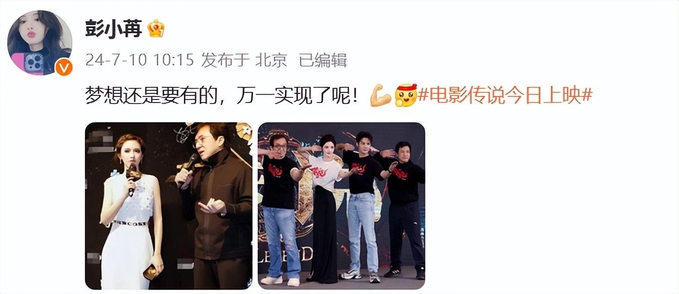 《传说》提档710上映,彭小苒晒和成龙多年前合照感慨:梦想还是要有的,万一实现了