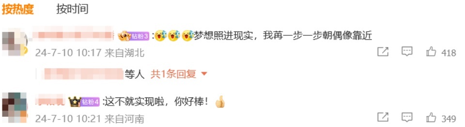 对此,粉丝们纷纷在评论区祝贺彭小苒追星成功:“梦想照进现实,一步一步朝偶像靠近。”