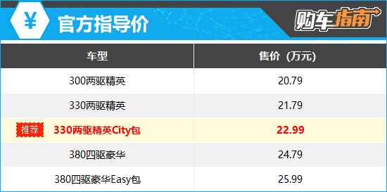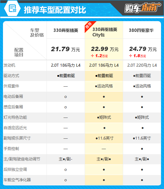 从配置来看,推荐车型较330两驱精英增加了运动风格外观套件,相信年轻人都会喜欢。同时,配置上还增加了矩阵式大灯、自适应远近光、11.6英寸副驾娱乐屏、副驾驶座椅电动调节,并且电动后备厢、后排独立空调以及车载空气净化器等配置由选装变为标配,价格仅增加1.2万元,性价比极高。